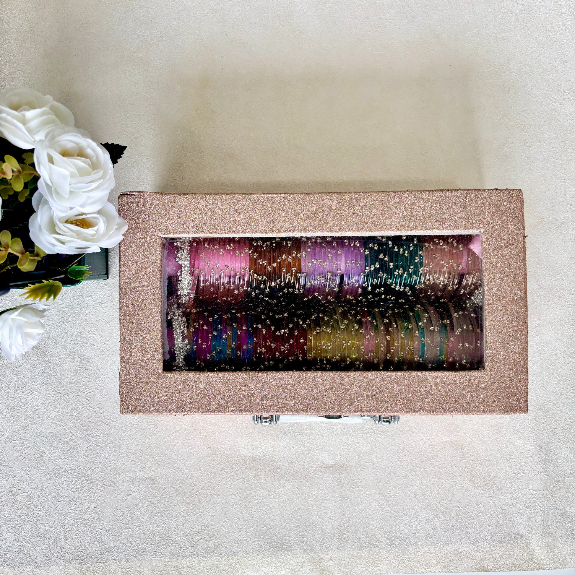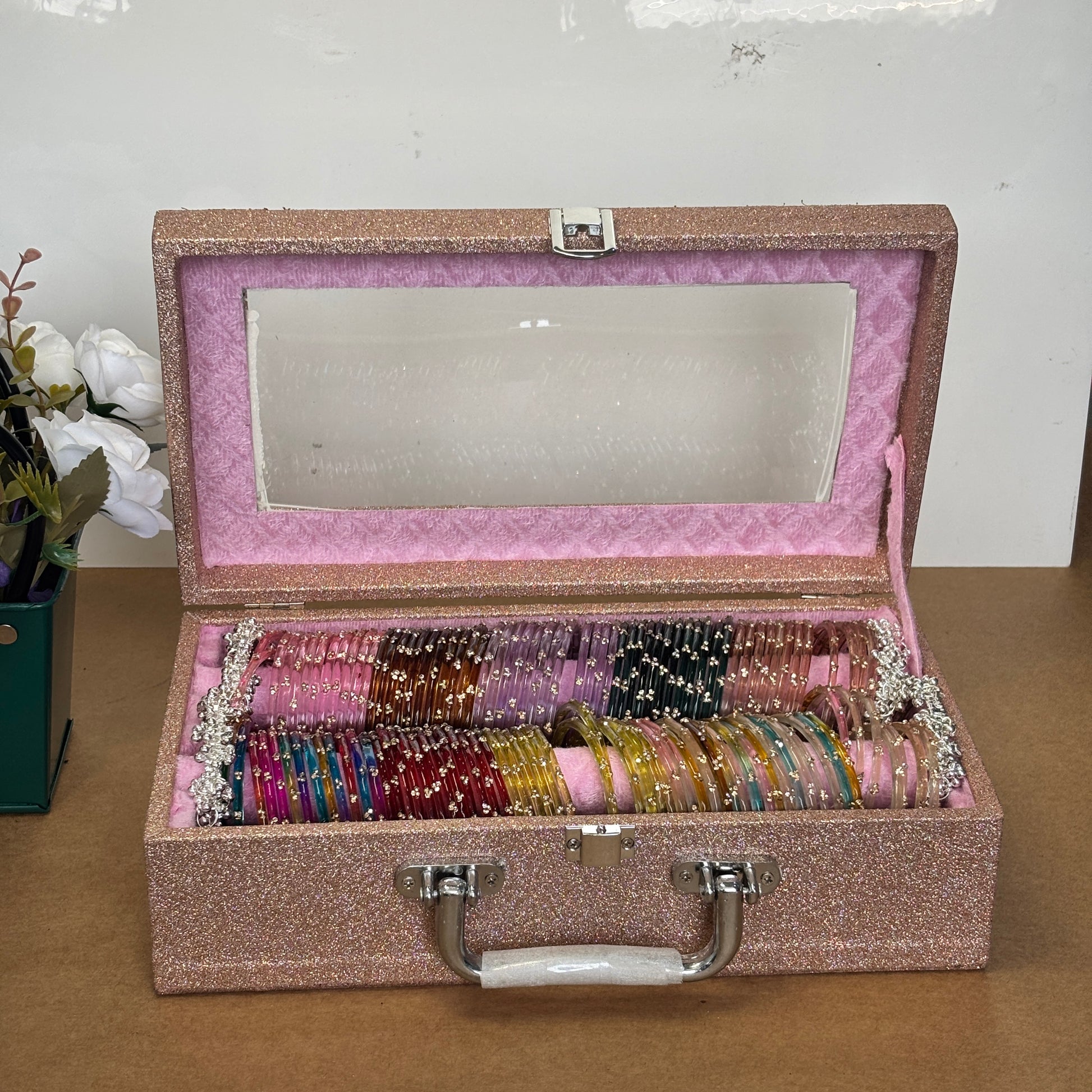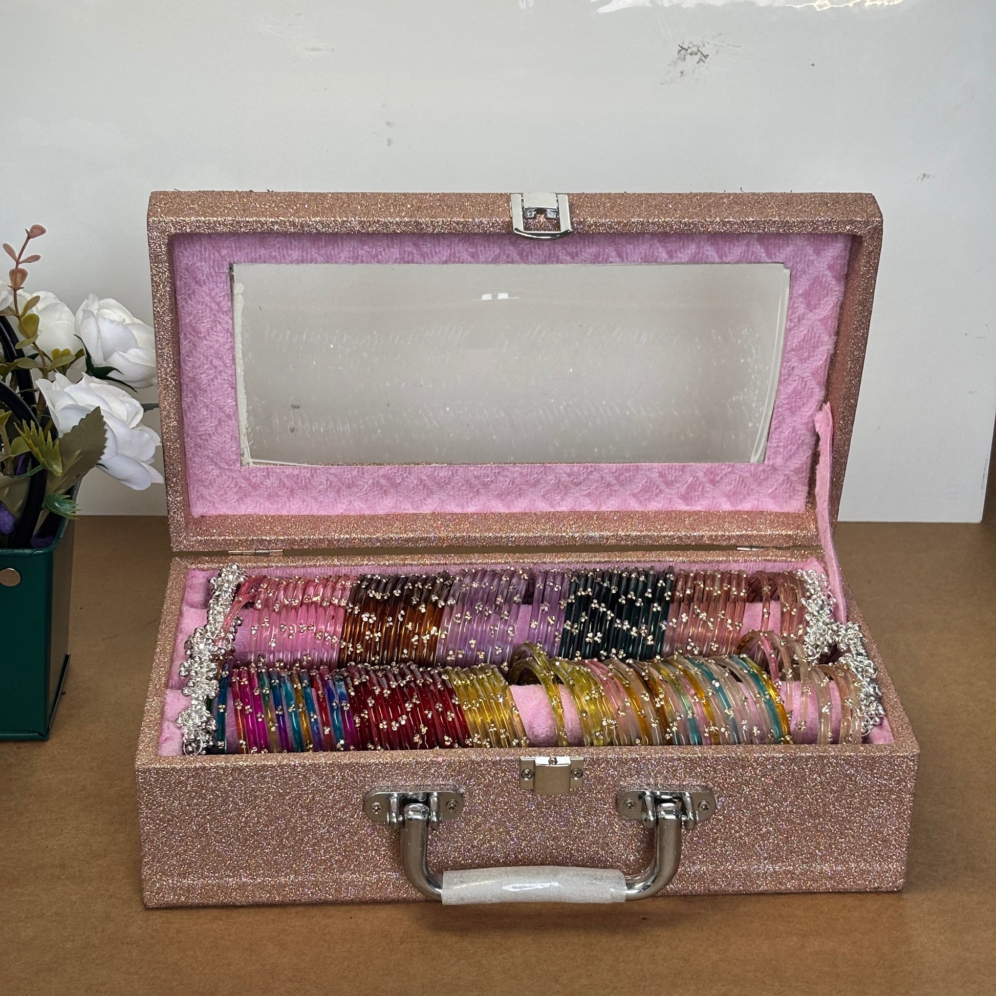With its elegant pink velvet interior, transparent lid, and vibrant designer bangles, this set blends tradition with luxury.
